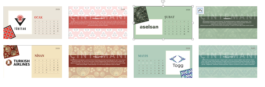 • Dijital Marka Entegrasyonu ve Grafik Tasarım: Motifin modern dünyada sürdürülebilirliğini sağlamak amacıyla, Türkiye’nin öne çıkan küresel markalarının logolarına Çintemani motifini entegre ettik. Adobe Photoshop kullanarak gerçekleştirdiğimiz bu logo çalışmalarını, daha sonra Canva platformu üzerinden dijital bir masa takvimi tasarımına dönüştürdük.